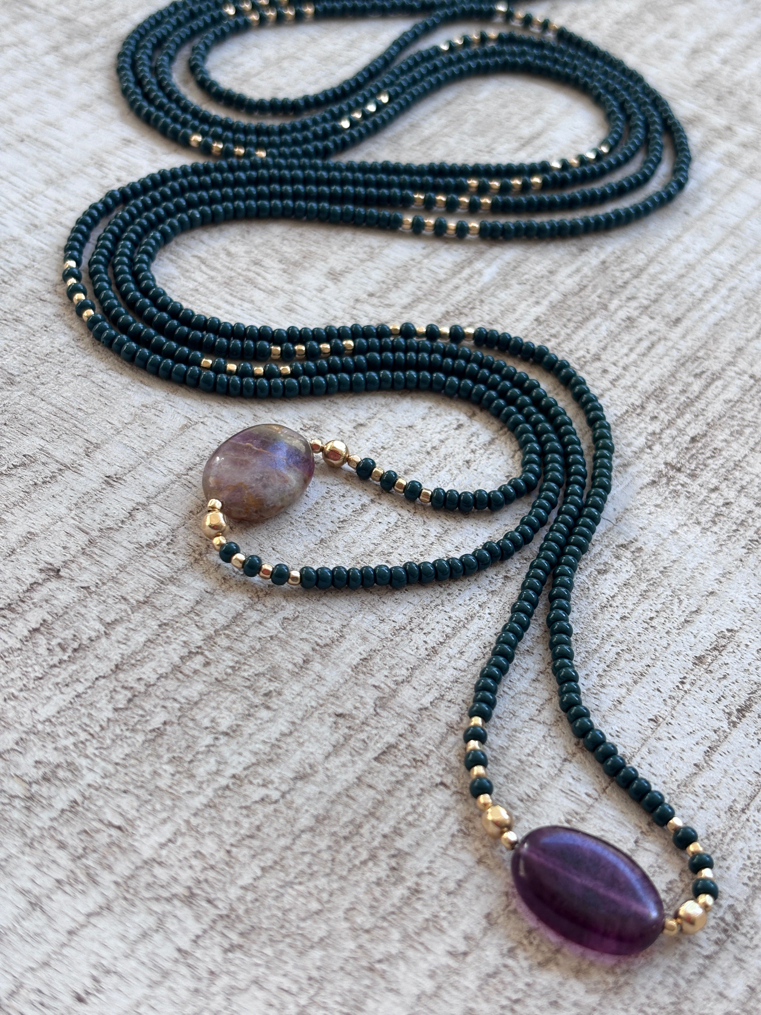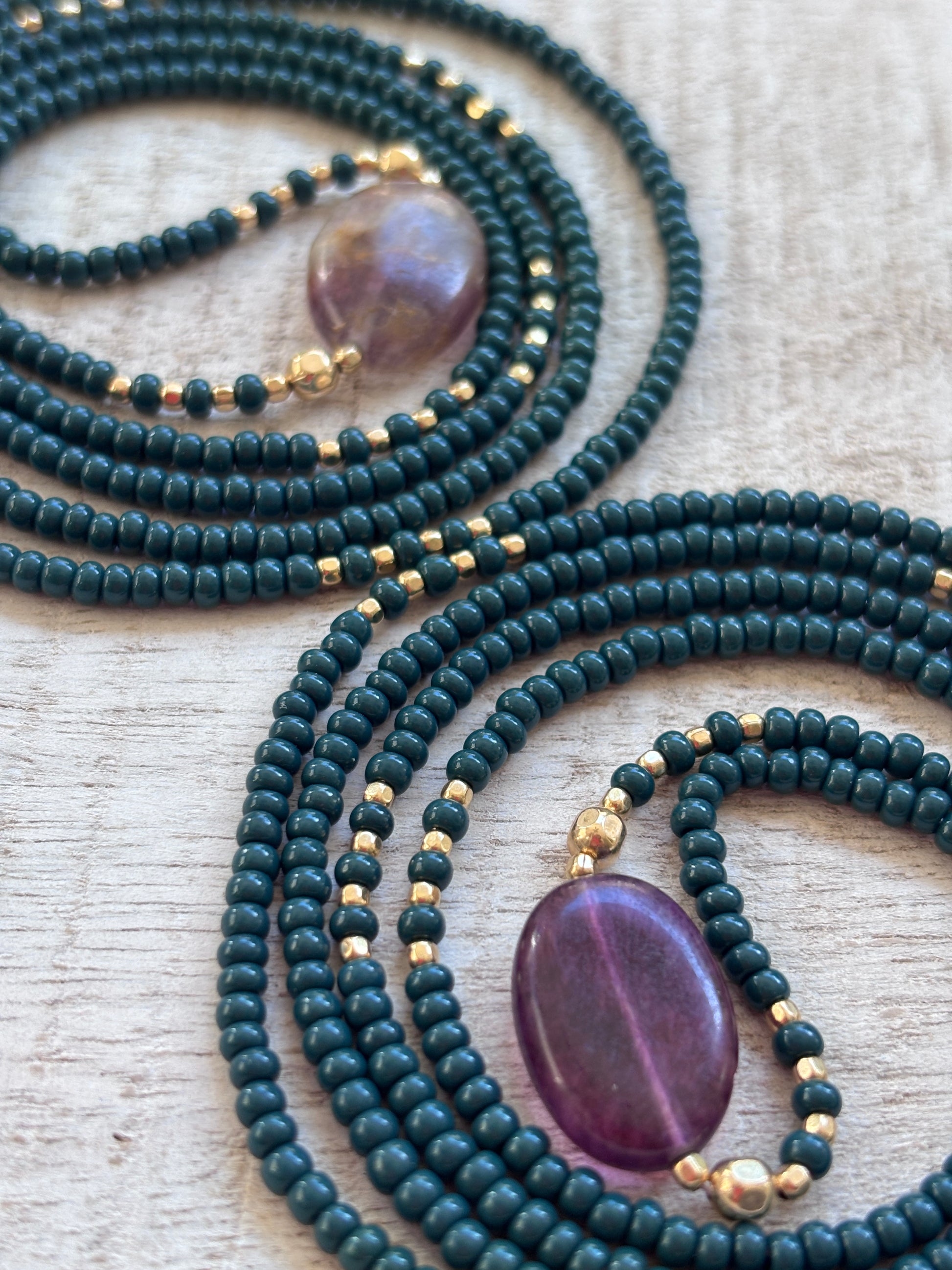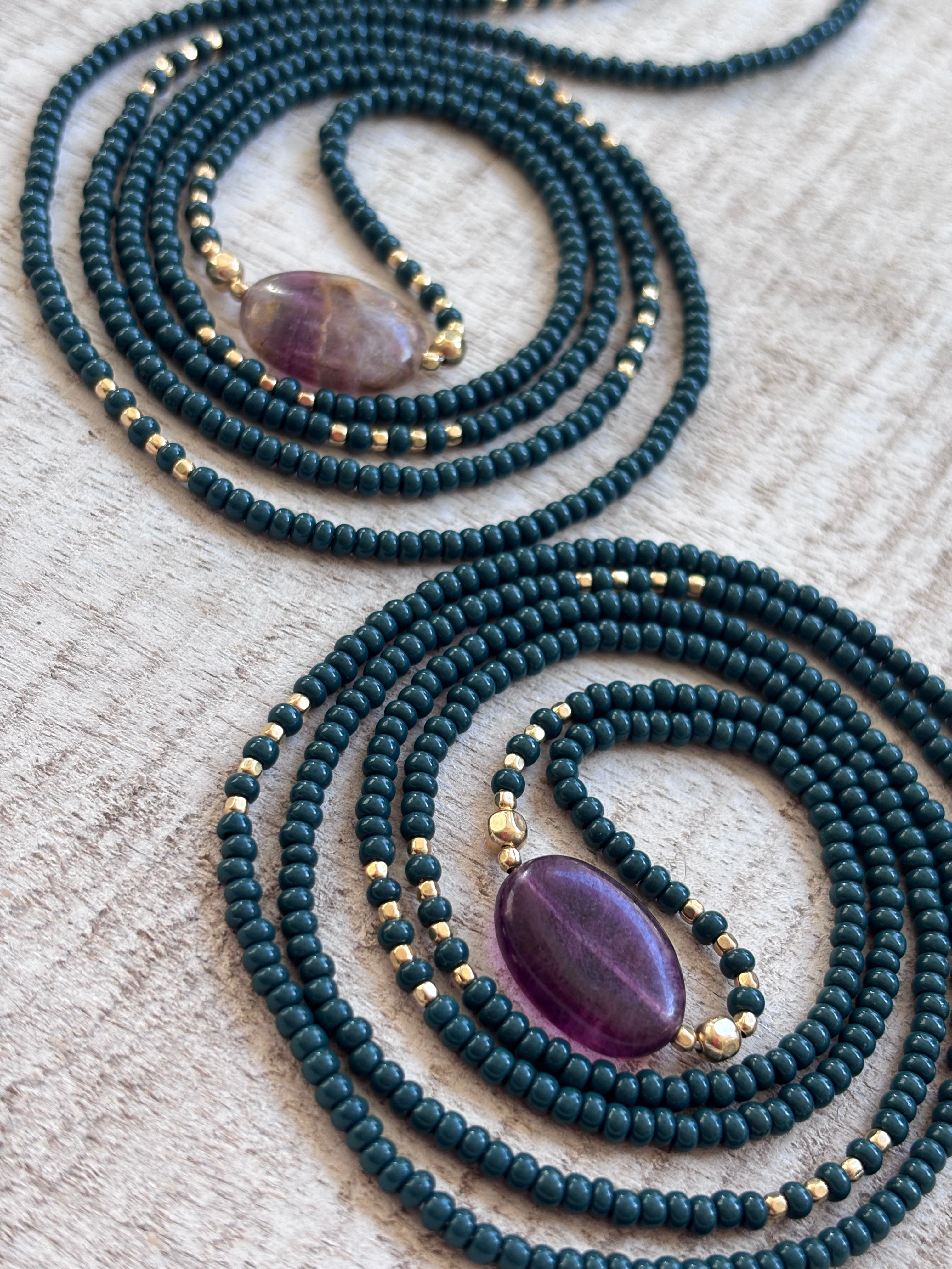The Midnight Veil Waistbead is a rich strand of deep turquoise glass beads, adorned with 14k gold diamond-cut accents and anchored by a luminous fluorite centerpiece. Inspired by the quiet allure of the night sky meeting deep waters, this waistbead carries a sense of mystery, clarity, and quiet power.