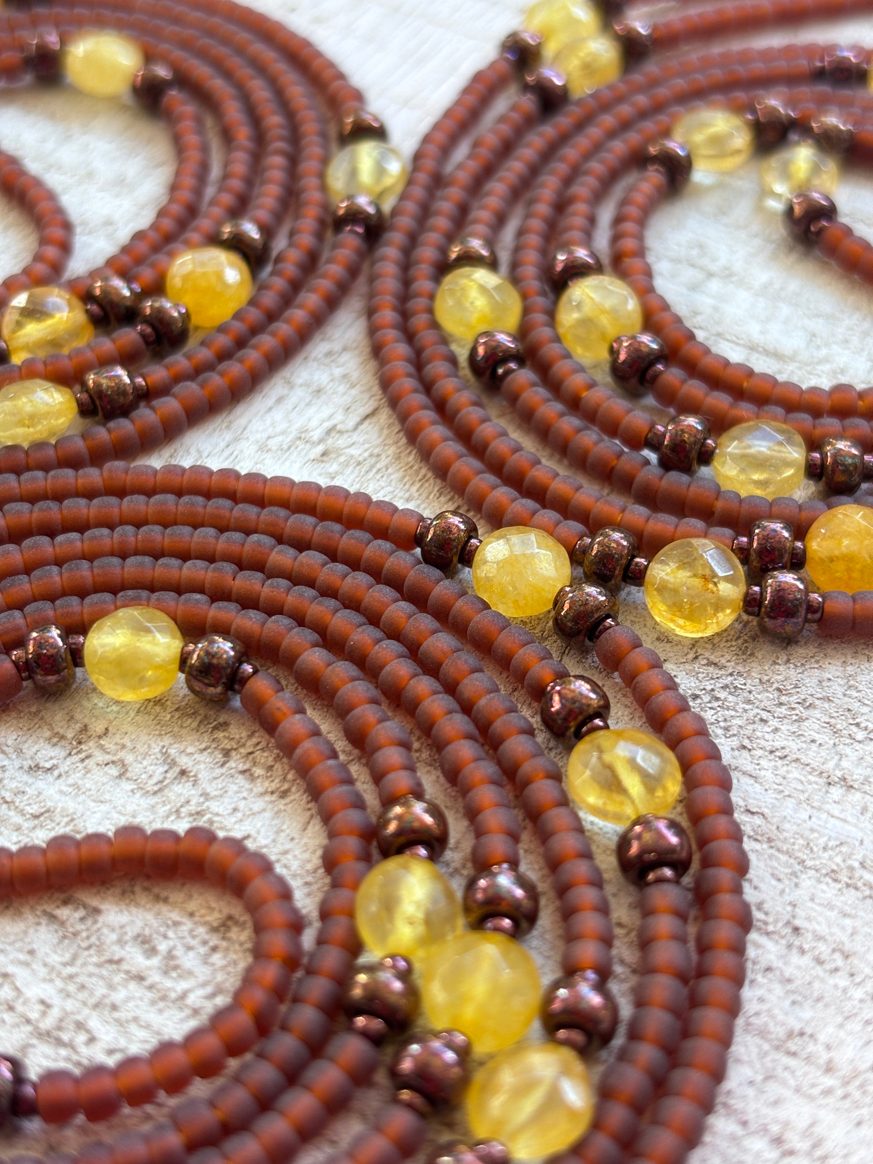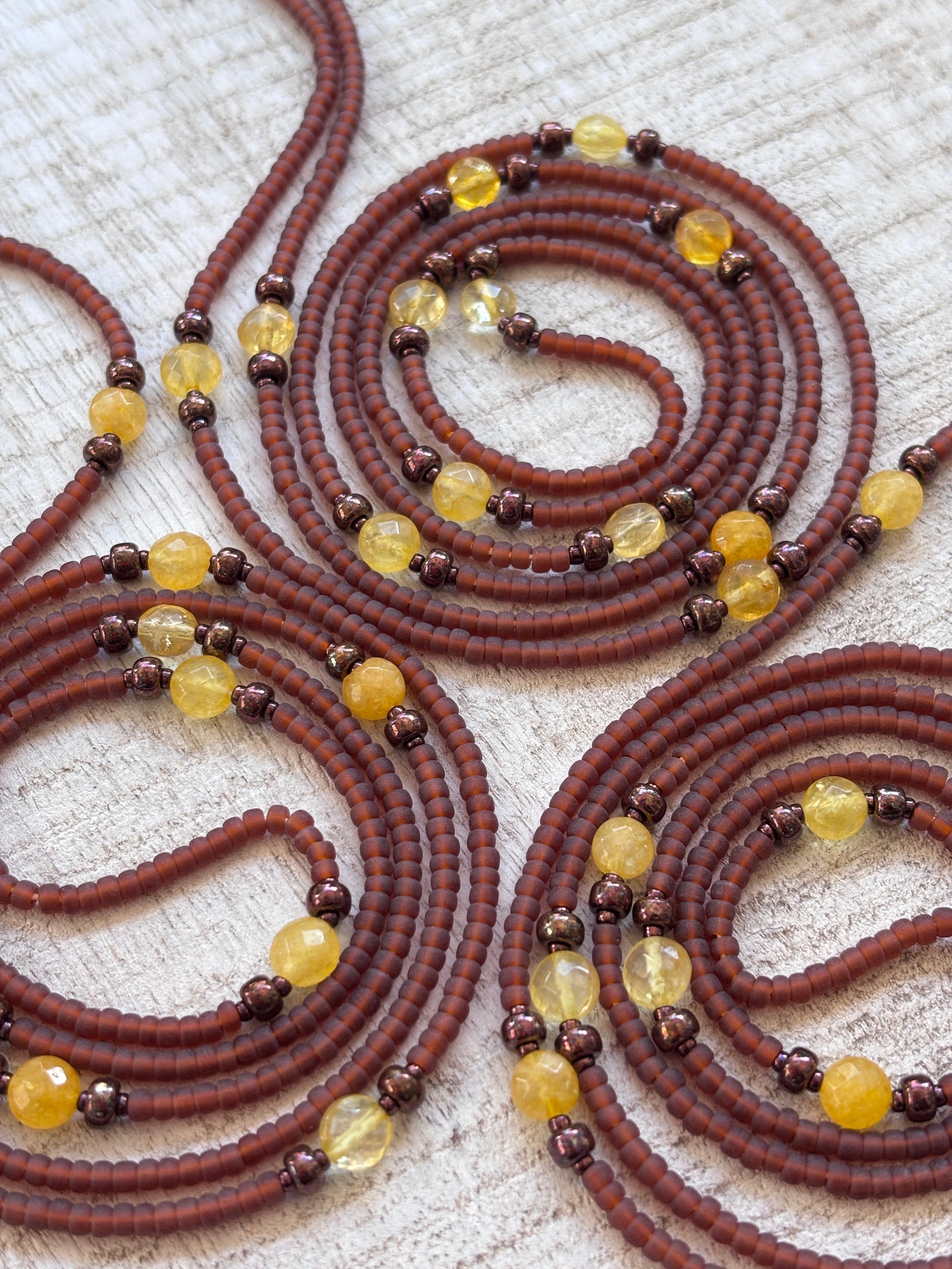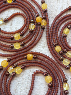 The Sweet Nectar Waistbead is a warm blend of matte brown glass beads, radiant bronze accents, and glowing citrine gemstones. Inspired by the richness of earth and the golden sweetness of nature’s offerings, this strand is grounding, nurturing, and full of quiet vitality.